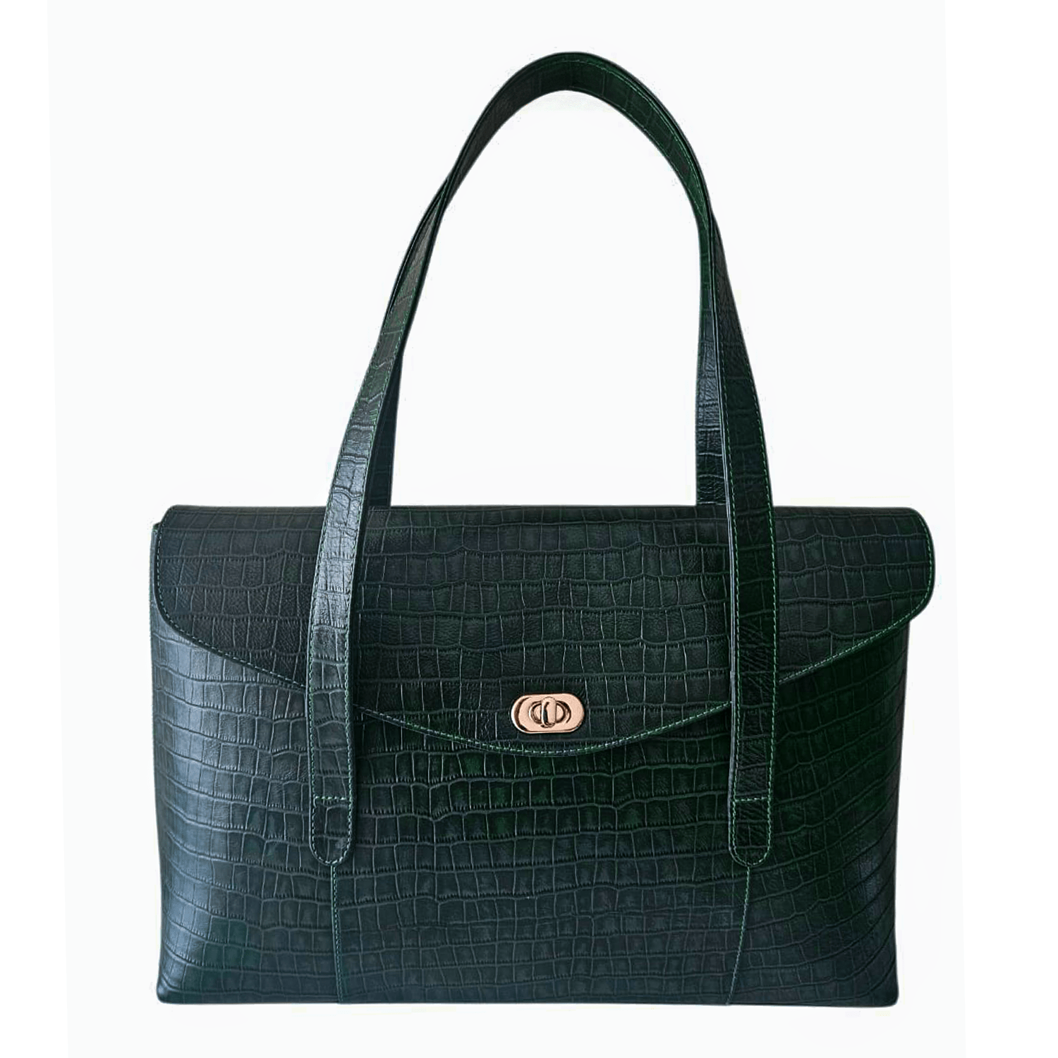 Tote en cuero verde grabado elegante y acabado sofisticado. Incluye herrajes bañados en oro, asa de mano y asa larga ajustable (removible). Cierre metálico seguro, bolsillo interno con cierre y base con patitas protectoras para mayor durabilidad.