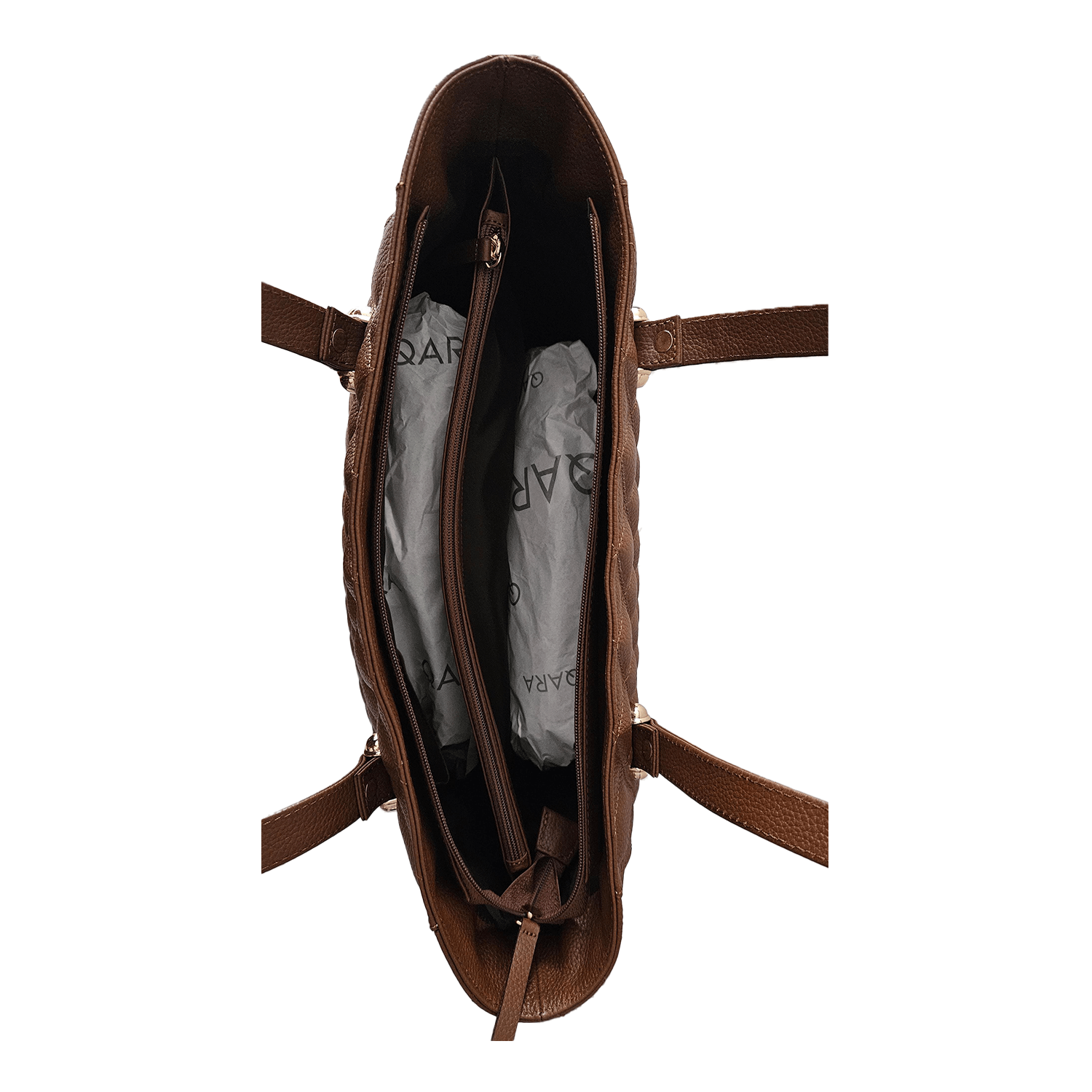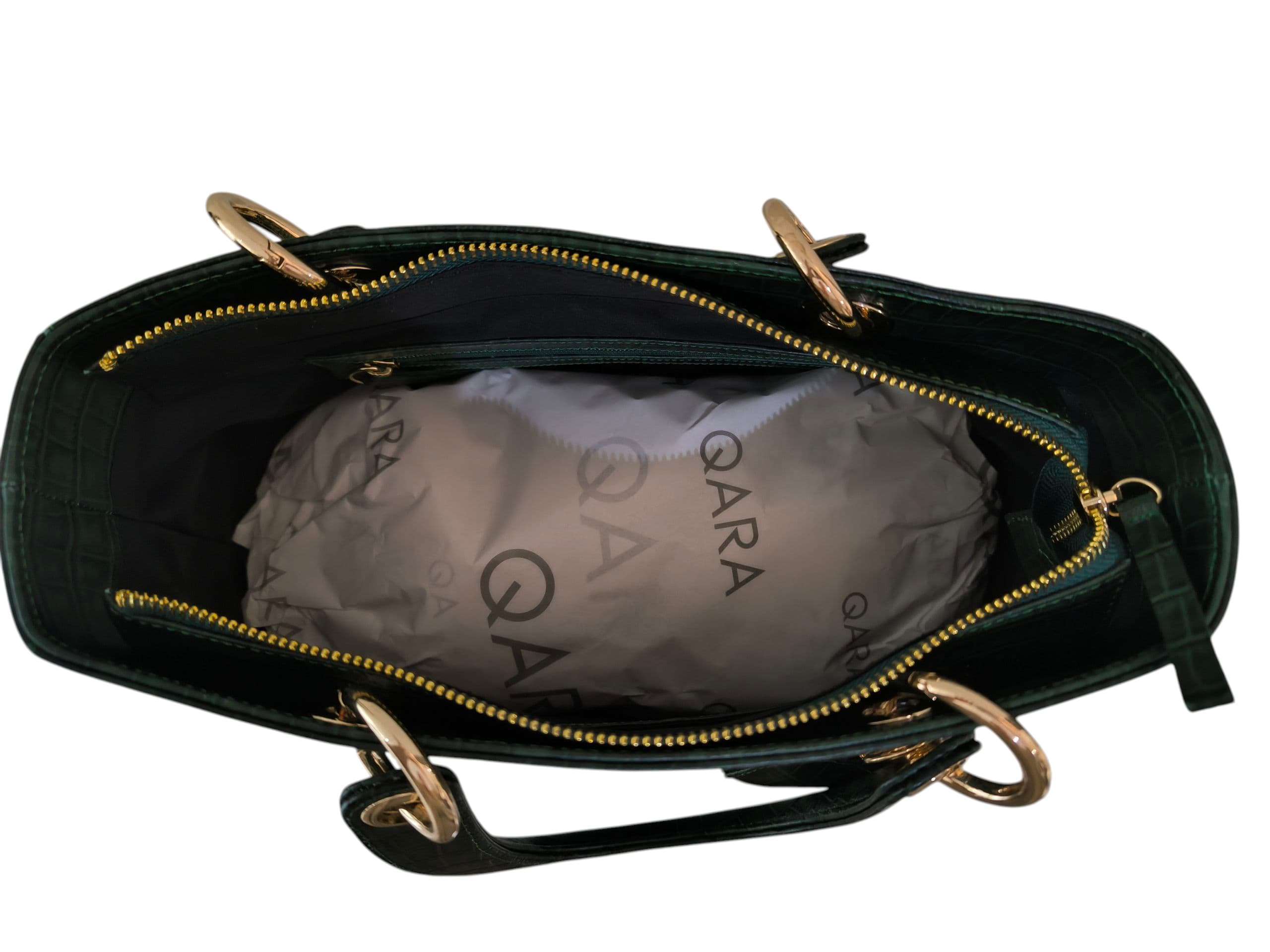 Cuenta con asas al hombro que permiten un uso cómodo y versátil, mientras que los accesorios bañados en oro aportan ese toque de lujo discreto que define a QARA.