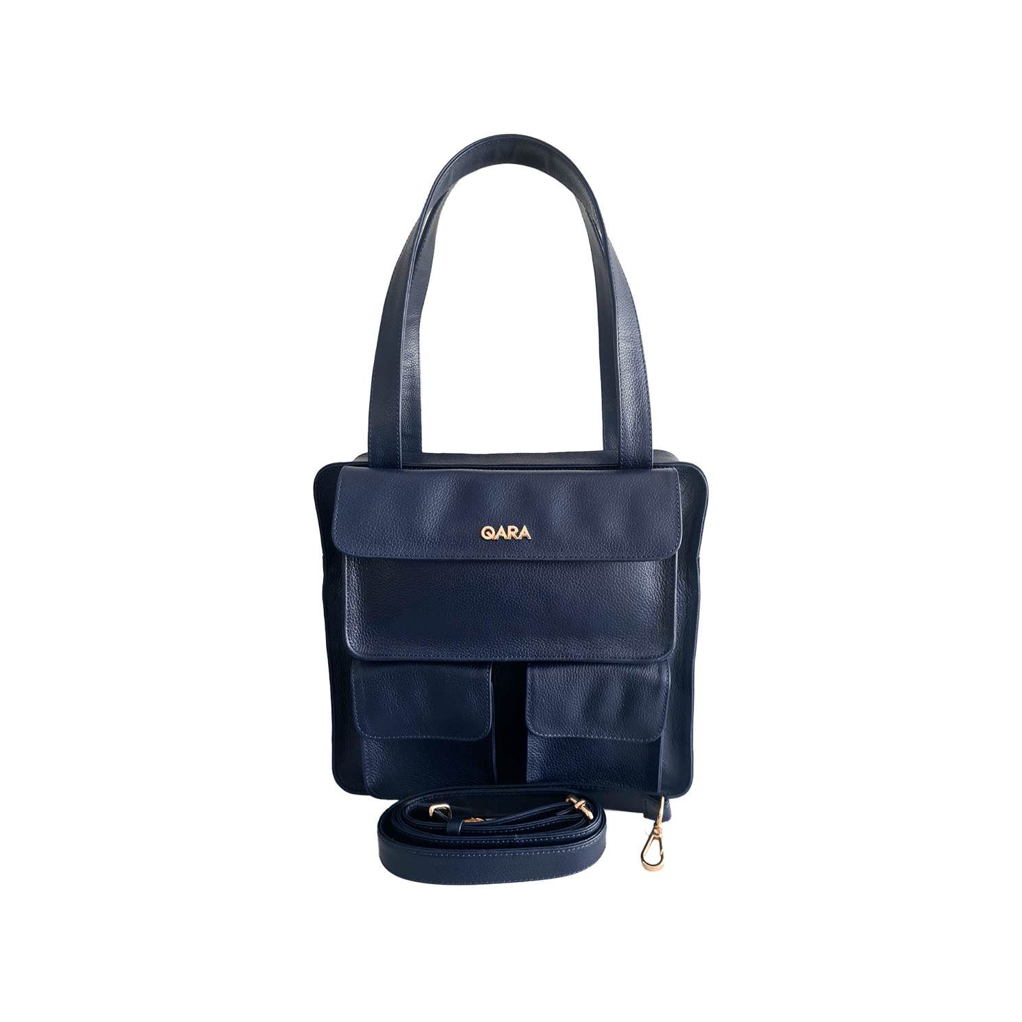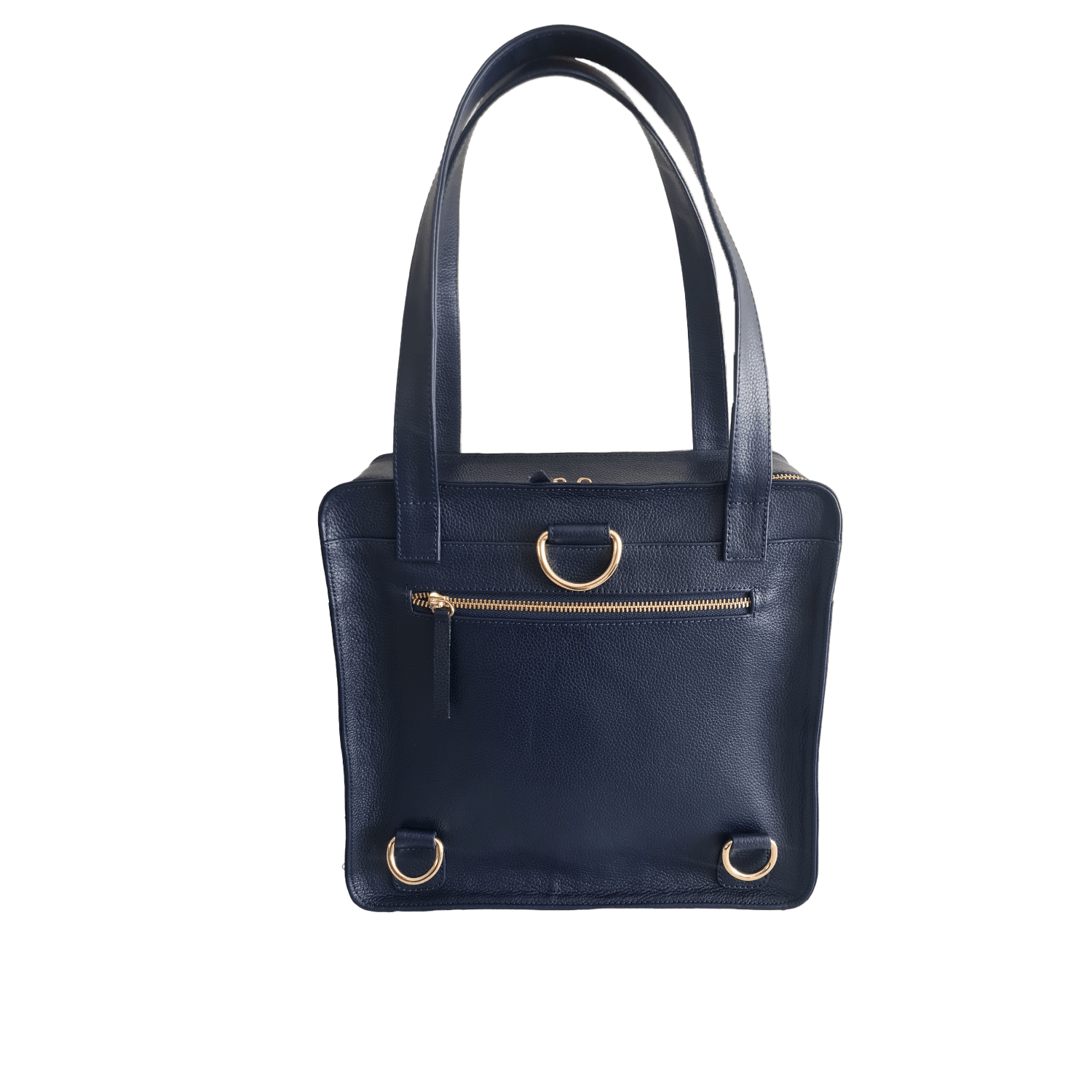 Este modelo combina elegancia y utilidad con detalles pensados para facilitar tu rutina. Tiene dos asas cómodas para el brazo y una asa larga ajustable que te permite llevarla como morral o convertirla en mochila, pasándola por tres discretos ojalillos en la parte posterior.
