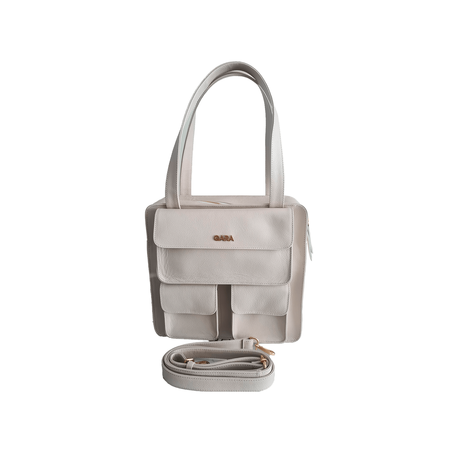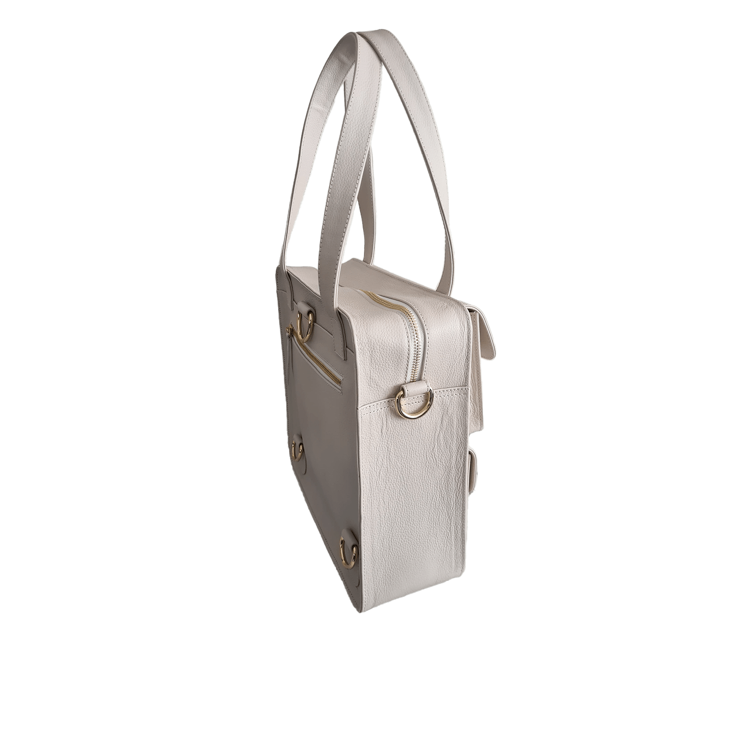 Este modelo combina elegancia y utilidad con detalles pensados para facilitar tu rutina. Tiene dos asas cómodas para el brazo y una asa larga ajustable que te permite llevarla como morral o convertirla en mochila, pasándola por tres discretos ojalillos en la parte posterior.