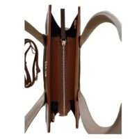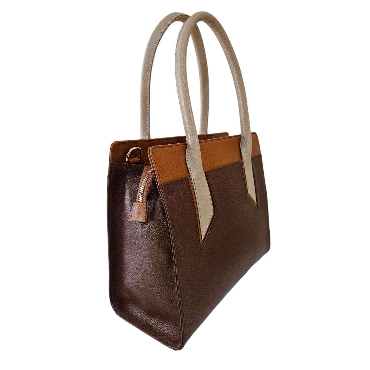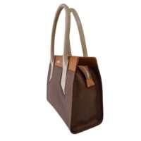Lo que hace única a la Cartera Luisa es su combinación de colores cuidadosamente seleccionados. En su mayoría, está elaborada en un profundo y sofisticado marrón chocolate, que aporta elegancia y un aire clásico que combina fácilmente con cualquier atuendo. Este tono oscuro se complementa perfectamente con detalles en cuero color natural y cuero color arena, que añaden un contraste visual atractivo y versátil, haciendo de este bolso un accesorio que puedes llevar tanto en ocasiones formales como en salidas más casuales. La integración de estos tres colores le da dinamismo al diseño sin perder el toque sobrio que define a esta pieza.